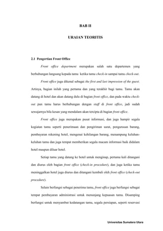 Front office rumah sakit customers abstract this research was conducted to find out how the responsibility of the hospital front office Dalam tugas dan tanggung jawab staff front officeharus dapat menciptakan pelayanan yang cepat tanggap terhadap masalah efektif efisien dan mengutamakan keselamatan pasien. Hal ini dilakukan untuk mencegah kerusakan-kerusakan yang terjadi di kamar hotel. Ubah RC dan perbarui profil tamu.
